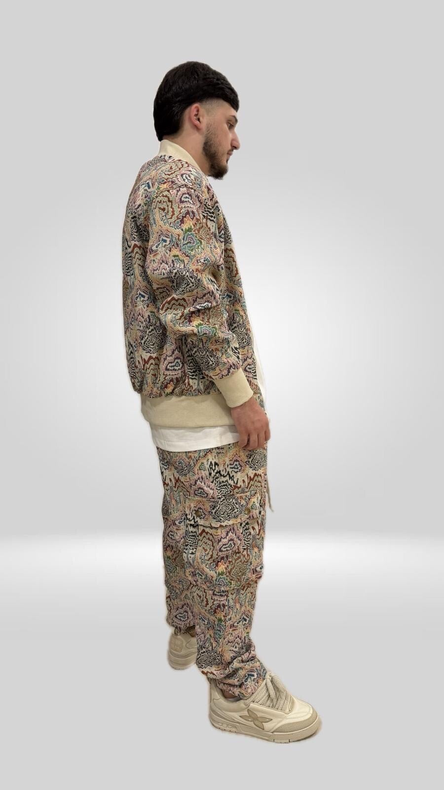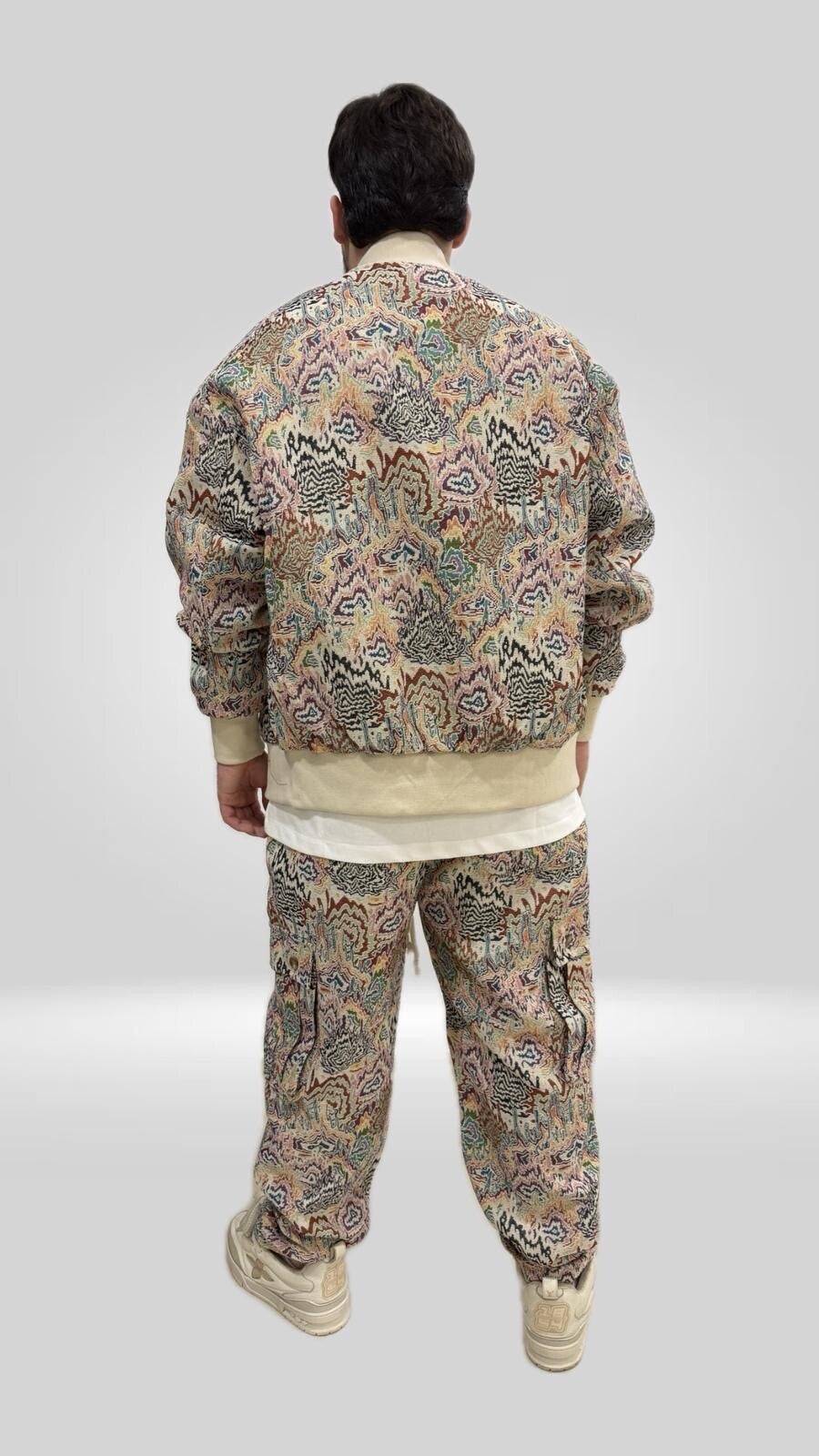Completo streetwear da uomo che unisce design contemporaneo e comodità. La giacca bomber con zip e i pantaloni cargo coordinati presentano una fantasia astratta multicolor, con toni beige di base arricchiti da sfumature rosse, verdi, nere e azzurre.