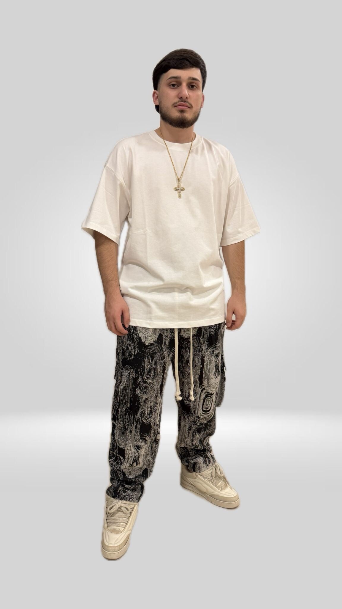 Pantaloni cargo streetwear da uomo con fantasia astratta nei toni nero e bianco. Realizzati in tessuto resistente ma confortevole, si distinguono per lo stile urban originale e versatile.